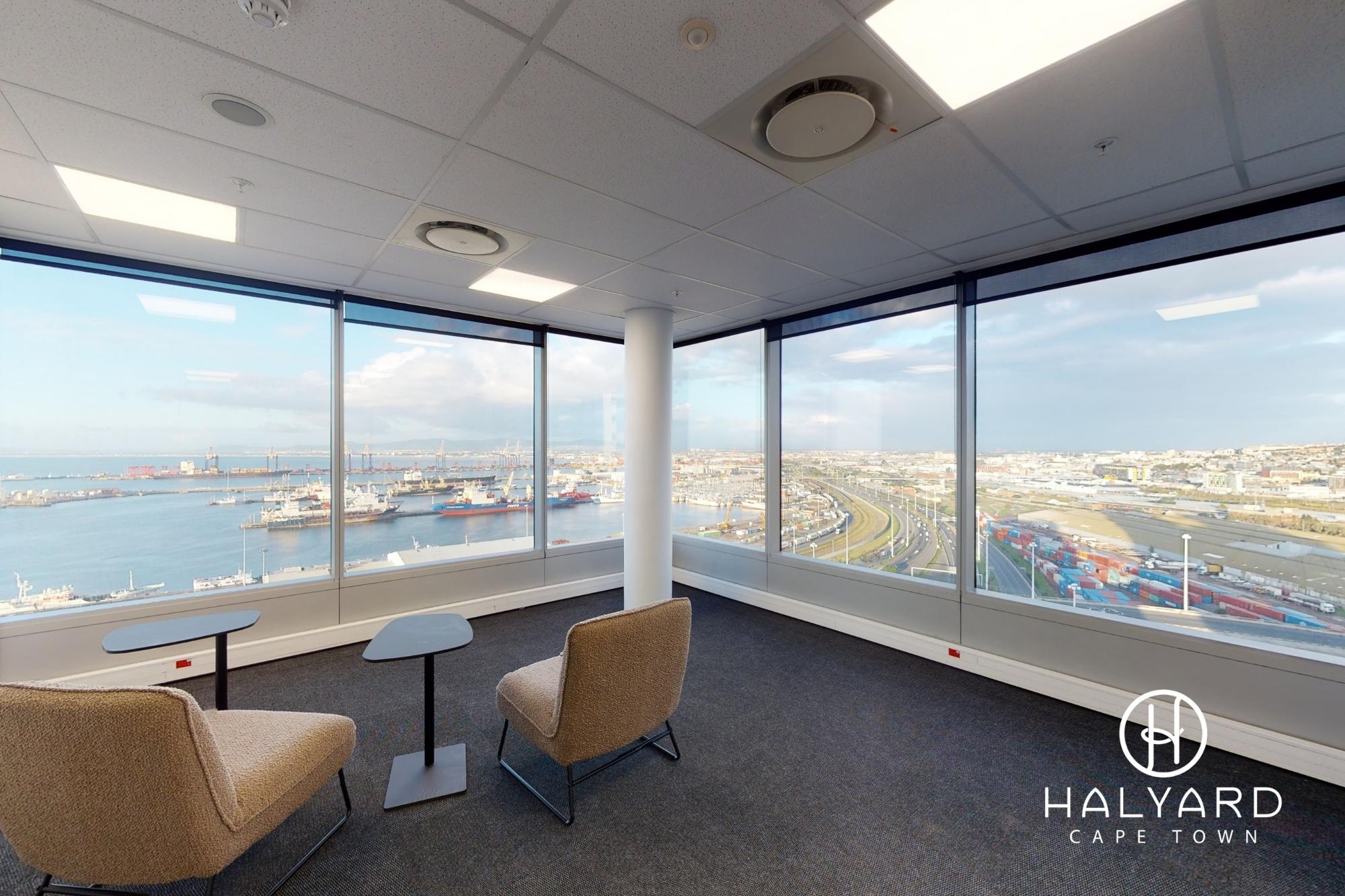 Breakaway/Lounge Spaces – Large windows offering a stunning panoramic view of a harbor and cityscape.Perfect for taking in the scenery.